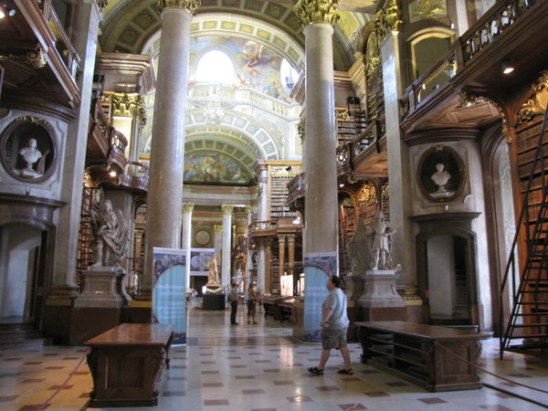 Then we split up to go to different museums in the complex. Adam and I went to the State Hall of the Austrian National Library. It’s this magnificent Baroque library finished in 1726 with a collection spanning from 1501-1850. The more modern collection is in a different building (which was closed), but this is the good stuff. There’s Adam wandering through the vast space.