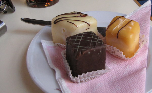 We had petit fours at a branch of Aida, a cafe chain that seems to be everywhere here. We wandered through bookshops, housewares stores (I bought a madeleine pan for 4 Euros!!), and I’m now coveting a purple Birkin knockoff made of Italian leather for 95 Euros. I’m still thinking about that bag, and I’m wondering if I need to make a detour back over to that shop….