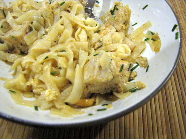 I’ve been swamped with the library project all week, so I haven’t cooked anything new and exciting in a while. I did bake 2 cakes yesterday, which I will post more about later. But tonight for dinner I made pad thai, which I’ve been meaning to try my hand at for ages. I switched out the shrimp in the original recipe for chicken.
