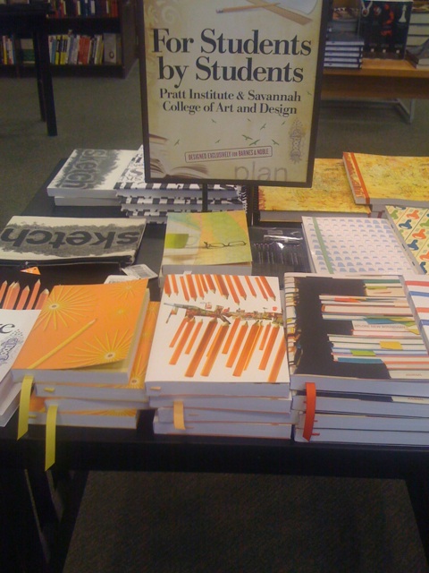 I spotted this display at Barnes and Noble today. My grad school alma mater, Pratt Institute, and Savannah College of Art & Design (I did my undergrad degree in Georgia) have joined forces with B&N to showcase notebooks and accessories with designs by their students. I love the idea, the products, the chance for students to see their designs for sale. I bought a few of the items to show my support. I could only find a page for SCAD, so search for Pratt at bn.com for those products.