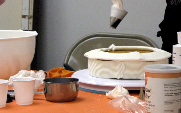 Last night was the first session, and our extremely patient and sweet teacher (some of my classmates would NOT stop talking while she was talking) showed us how to properly ice a cake. This is worth the $30 class fee right there to me. I know, $30! It’s a steal, AC Moore classes are great. This is my first one, and so far I’m not disappointed. It would seem the biggest problem with my frosting skills is that I need to be using about twice as much frosting as I was previously using. And I need to cut the dome off so the cake is level.