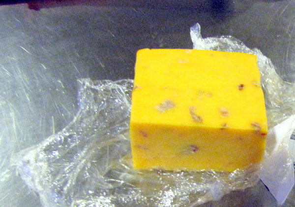 I served this with my Macaroni and Cheese, which I’ve tweaked after making it for the cookout and for dinner last night. I might not do that again, it’s kind of a heavy meal to have steak AND mac ‘n cheese. I could eat the pasta as dinner itself, but Adam thinks of it as a side dish and needs something else with it. Next time I make the steak I’ll serve it with some simple orzo or roast potatoes or something. Anyway, the macaroni and cheese page is updated with more photos and some more refined directions. I found this crazy Bacon Cheddar cheese block at Whole Foods this week; cheddar with bits of real cooked bacon dotted throughout.