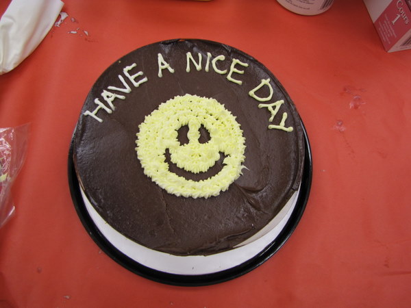 But I did have the only chocolate frosted cake, and when I saw this at the grocery store next to the AC Moore where my class is held, I thought it was crying out for a smiley face. And since I’ve been feeling pretty sorry for myself after the beating my legs took with this week’s shenanigans, I needed a smiley face, too. I bought a round cookie cutter to give me an outline, and I did everything else freestyle. I could do this on a cake because I practiced on that fancy board in the second photo.