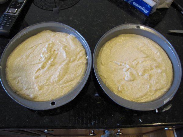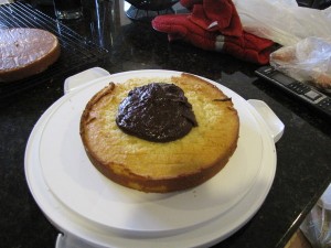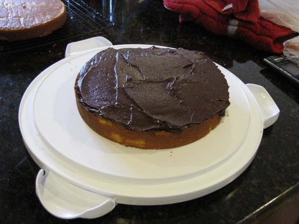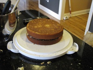 Layer two is now on. I arranged the layers so the top of the 2 cakes actually face each other in the middle. That’s the bottom of the 2nd layer you see on the very top. This is probably perfectly logical, but I never thought to do these kinds of things before.