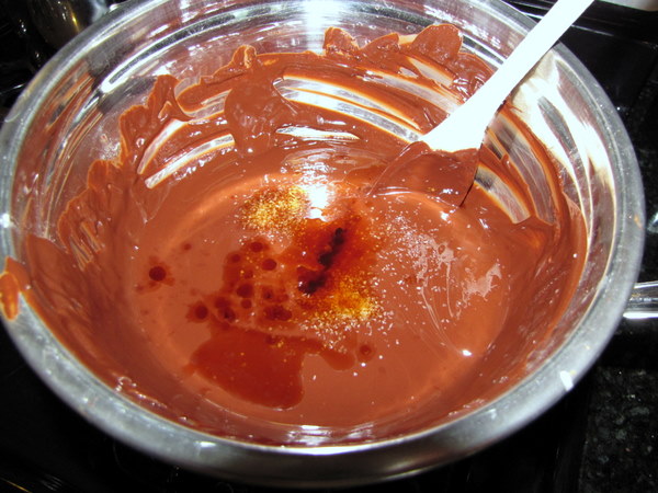 Melt the chocolate in a double boiler (I use a small saucepan of simmering water and put a metal mixing bowl on top of it and melt the chocolate in that). I added a stick of the butter, cut up, to the chocolate because it makes it nice and melty. Add the vanilla and salt to the chocolate mixture until the salt dissolves.