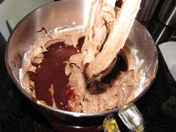 Slowly pour in the melted chocolate mixture.