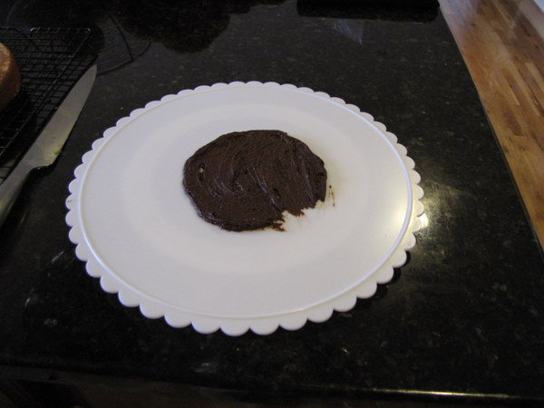 A dollop of frosting to stick it to the plate. I actually took this photo then decided to use the base of my cake caddy instead, so it looks different in the rest of the photos. Also, I forgot to put pieces of parchment paper under the cake to keep the plate it’s on from getting dirty. So now my cake caddy looks very chocolatey.