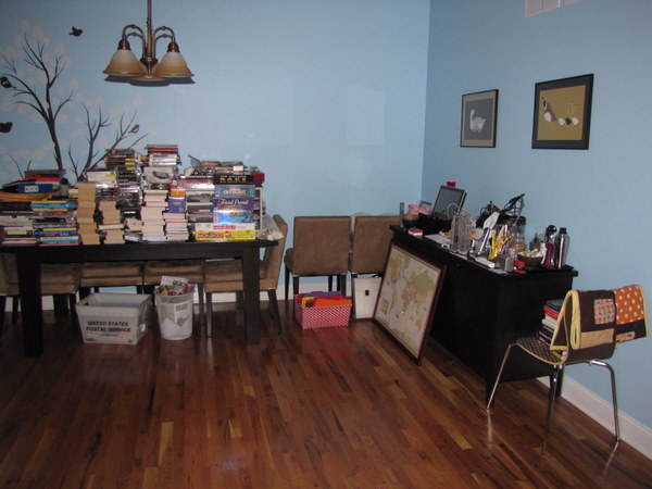The dining room has been invaded by books! Temporary storage for library stuff.