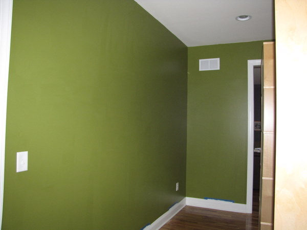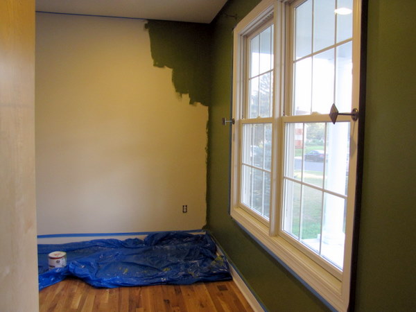 And it’s done, it’s painted. The furniture isn’t back in yet because I want to do some rearranging. And I’m still fussing with the trim–we used Ralph Lauren’s Olive Tree for this room, but the RL paint is a little stretchier and doesn’t leave as neat a line when the tape is pulled off (I never had this problem with Benjamin Moore paint).