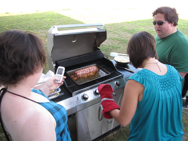 Laura Ann and Adam put it on the grill while Merdith documents for posterity.