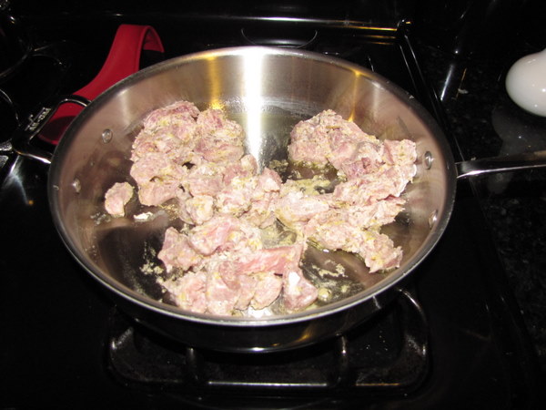 Heat a deep skillet or pot over high heat and add the olive oil. Brown the pork in batches, 1 minute per side; transfer to a plate.