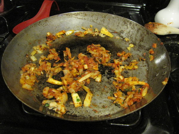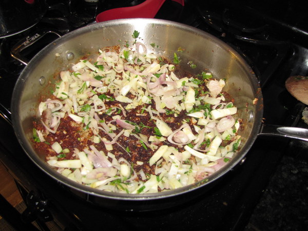 **This is where my dinner went off the rails. You can see the bottom of the pan already burning, and it turned totally black. But the shallots and fennel were on a bed of charred stuff, so I was able to transfer them unscathed to another pan.
