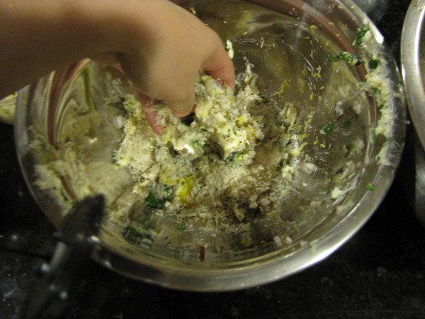 In a small bowl, mash the softened butter with the garlic, shallots, parsley, rosemary, red pepper flakes, lemon zest, lemon juice, egg yolk, panko, 1/2 teaspoon salt, and 1/4 teaspoon of pepper until combined.