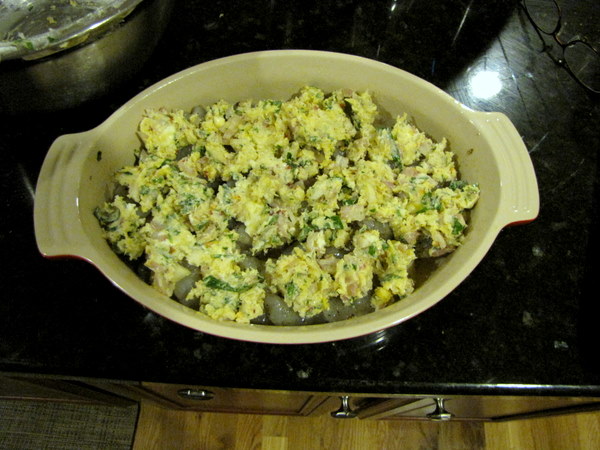 Starting from the outer edge of a 14-inch oval gratin dish, arrange the shrimp in a single layer cut side down with the tails curling up and towards the center of the dish. **I pulled my tails off and didn’t have enough shrimp to have them standing straight up in a smaller oval dish, and they were still completely fine.