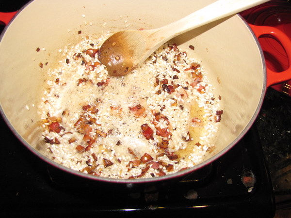 In a heavy-bottomed pot or Dutch oven, melt the butter and saute the pancetta and shallots on medium-low heat for 10 minutes, until the shallots are translucent but not browned. Add the rice and stir to coat the grains with butter.
