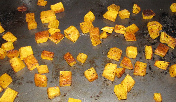 Peel the butternut squash, remove the seeds, and cut it into 3/4-inch cubes. You should have about 6 cups. Place the squash on a sheet pan and toss it with the olive oil, 1 teaspoon salt, and 1/2 teaspoon pepper. Roast for 25 to 30 minutes, tossing once, until very tender. Set aside.