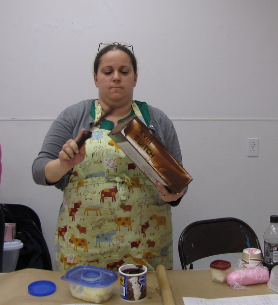 Rolling out the fondant. That circle came with my Wilton Cake Class #3 kit, it has measurements so you can figure out how big to make your fondant sheet.