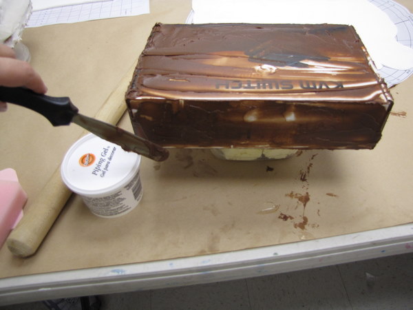 I didn’t have time to make a cake this week, so I practiced on a box. You have to put a very thin layer of regular frosting on the cake before adding the fondant. It makes it stick. You can also put a layer of Wilton piping gel along the bottom of the cake (box) to help with the bottom.