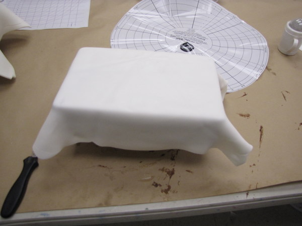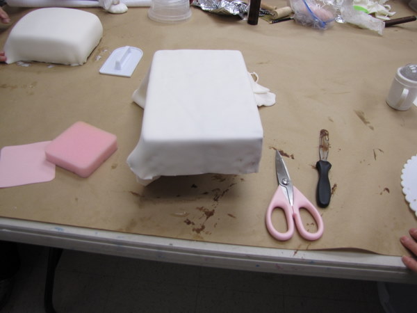 Drop the sheet of fondant on the cake (box). My instructor told us it helps to prop the cake up on something (mine’s on some tupperware). Then you use scissors, a knife, whatever to cut the fondant that’s longer than the sides.