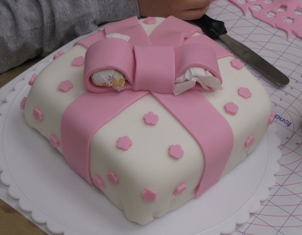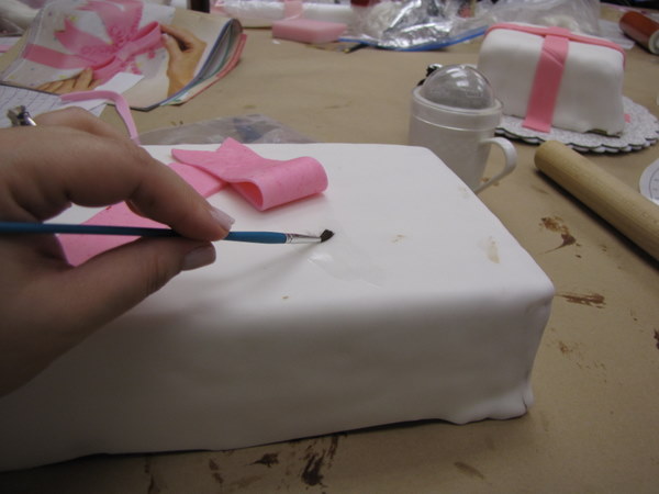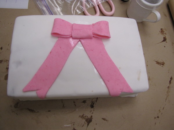 Someone else’s actual cake in class. The bow is stuffed with paper towels to keep the fluffy shape while it dries.
