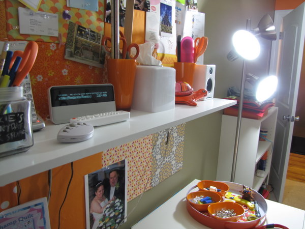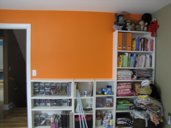 Orange wall before (that pile of fabrics was spread out all over the floor before I stacked it on my stool).