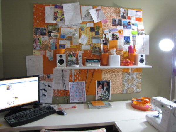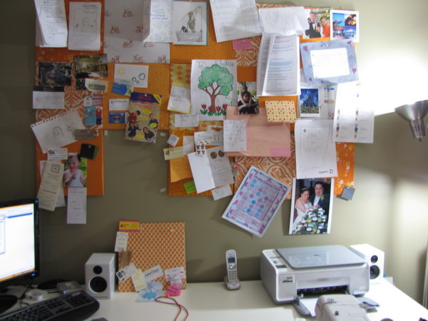 Bulletin board wall before. I’d already moved most of my stuff off the desk, but it was more cluttered. And those bulletin board panels were starting to come down, so I had to reinforce them again.