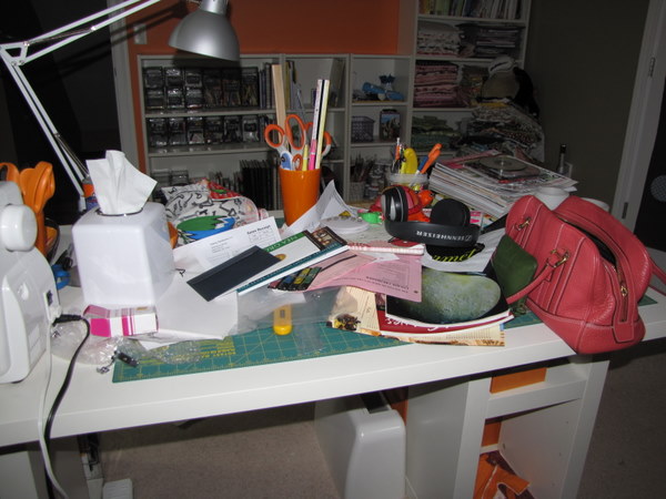 My work table last night. Therein lies the problem. Hard to sew when you can’t actually see the top of the desk.