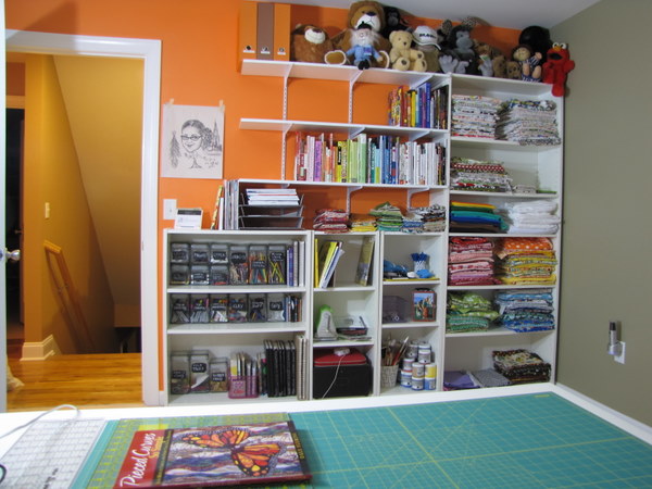 My studio was getting really cluttered, and it was keeping me from being able to work on anything. I was just getting so stressed out because I’ve outgrown most of my storage and needed to seriously declutter. So I decided to put up some wall-mounted shelves for additional space, and what was originally going to be a pretty simple moving of some stuff turned into a serious organizing weekend. A much needed organizing weekend. Now I’m extremely calm in here and can actually get going on holiday projects. Here are some before and after photos.