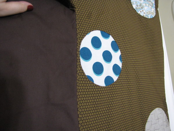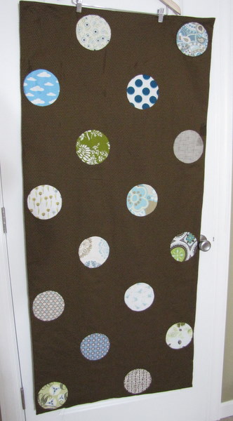 I also decided to not to quilt all over because I really like the circles as they are. So I also finished this like the baby blankets, using a take on a tie quilt to bind the 3 layers together. I used brown thread so it wouldn’t be too overt, leaving the circle design to really stand on its own.