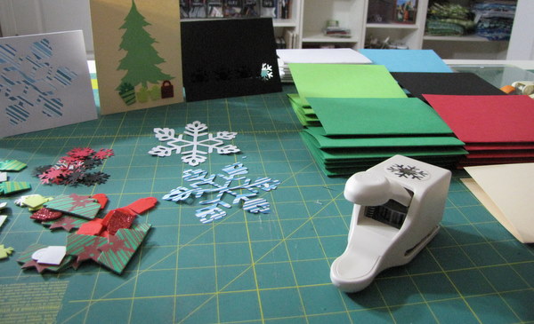 I’ve cut the card stock for about half the cards I’ll be sending this year, and that went pretty quickly. It’s just deciding on what paper to use and how to decorate the cards that’s more time consuming (and doing things like cutting trees upside down, accidentally gluing things to them, the usual hazards of cut-and-paste). But these might be ready to mail by Thanksgiving weekend, I need to track down some envelopes.