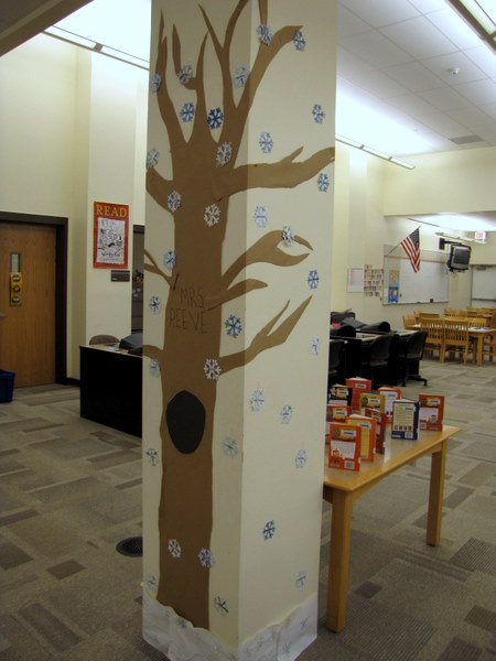 It’s great and wintry. Two of the 5th grade girls who are in our after school care program made the snow on the ground for me before Thanksgiving. During parent/teacher conferences week, when the kids had half days, they were at school for an extra long time. So I let them come into the library and go nuts with the glitter, and they made me enough snow for the library tree and the front library display.