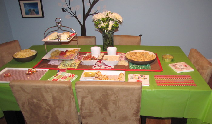 I took a different approach to our Christmas party this year. I probably put out more goodies than last year, but I scaled back on the planning and cooking/baking from, say, our cookouts in June and August. The truth is, Adam and I have both been under the weather for the past couple of weeks. We hosted Thanksgiving, which was wonderful but also took some of our steam. I just didn’t feel as organized and on top of things for this party. And we were not blessed with good weather last night. It was kind of a gross, rainy, snowy, nasty night. So we had 10 people after some cancellations, and I finally decided mid-afternoon yesterday to not make myself crazy with the spread and the decorating. I put out what I had done by then and decided to just go with the flow (surprisingly, this is really hard for me to do). We had plenty of food for everyone, and I just wanted to enjoy the company of those who braved the weather to come celebrate us.