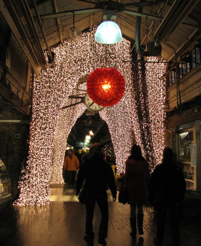 chelseamarketdecsThe weather was abysmal, pouring rain outside. But we ventured down the street to Chelsea Market (home of Food Network). We took pictures of each other by the festive decorations (mine is above) and bought lots of food. Bread twists from Amy’s Bread, brownies from Fat Witch Brownie, and something for Adam’s stocking.
