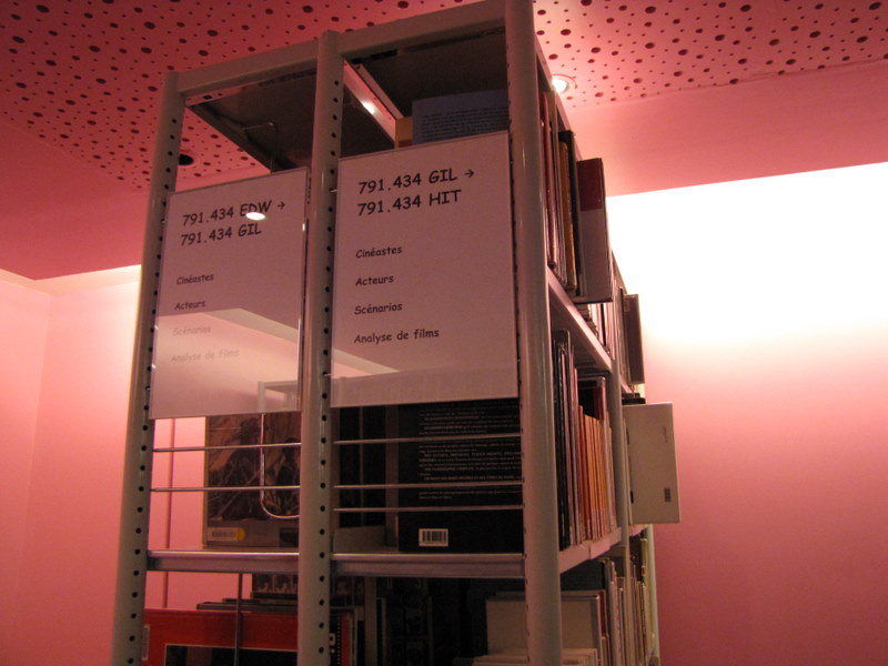 We went to the Forum Les Halles in the late afternoon. It’s a giant, overwhelming underground shopping mall. It was absolutely packed with people, but it did have this very cool film library in it (next to a screening house). Almost all the books in the library were under the 700 section of the Dewey Decimal system (where film and its subheadings would be), and the whole place has pink lighting. This delights me no end.