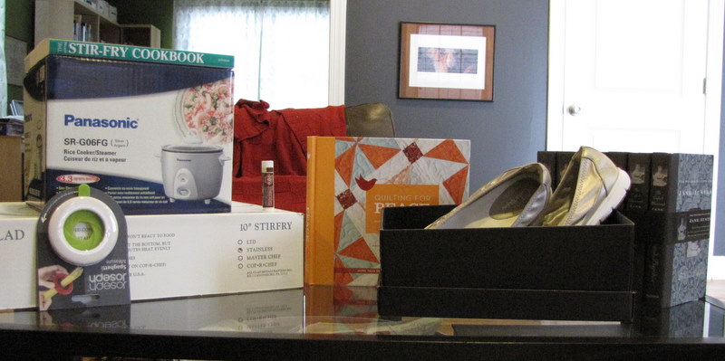Adam’s parents gave me Quilting for Peace, these Cole Haan shoes with Nike soles that I wanted, and a gorgeous collection of Jane Austen’s novels. Adam gave me a rice cooker and a stir fry pan, which are both going to be a huge help in my long-standing goal to start expanding my cooking repertoire. Now I don’t have to learn how to cook rice. And my mom gave me Martha Stewart’s Cooking School and this excellent Urban Decay palette inspired by Alice in Wonderland. Plus a Boden gift card from my friend Laura Ann. So much wonderful stuff! I don’t even know where to start playing.