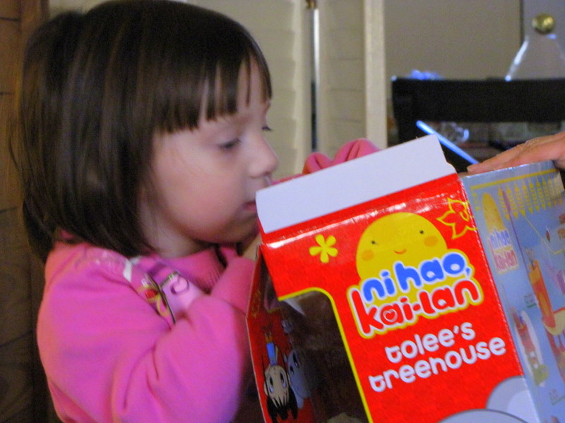 For Grace’s birthday we gave her a cell phone and a tree house playset from Ni Hao, Kai-Lan. This was a new discovery to us, I’d never heard of this show. But the stuff is so cute, I’m definitely on board after OD’ing on Dora the past few years.