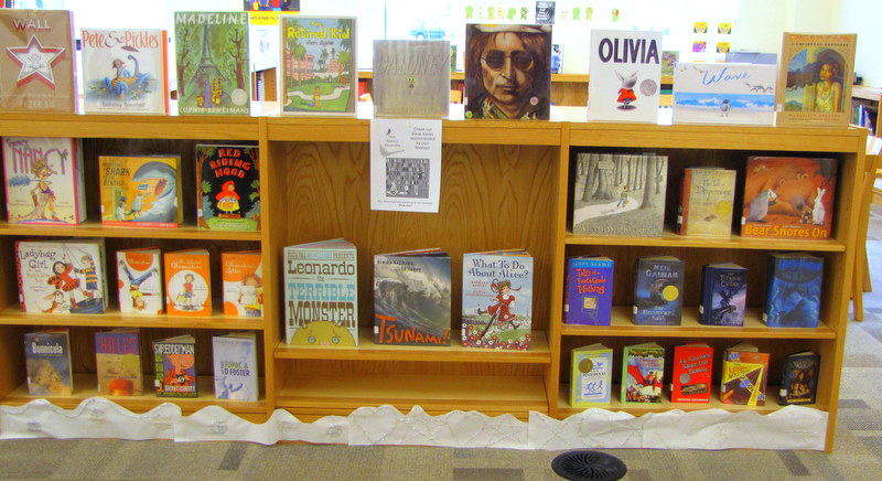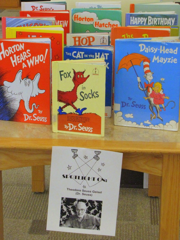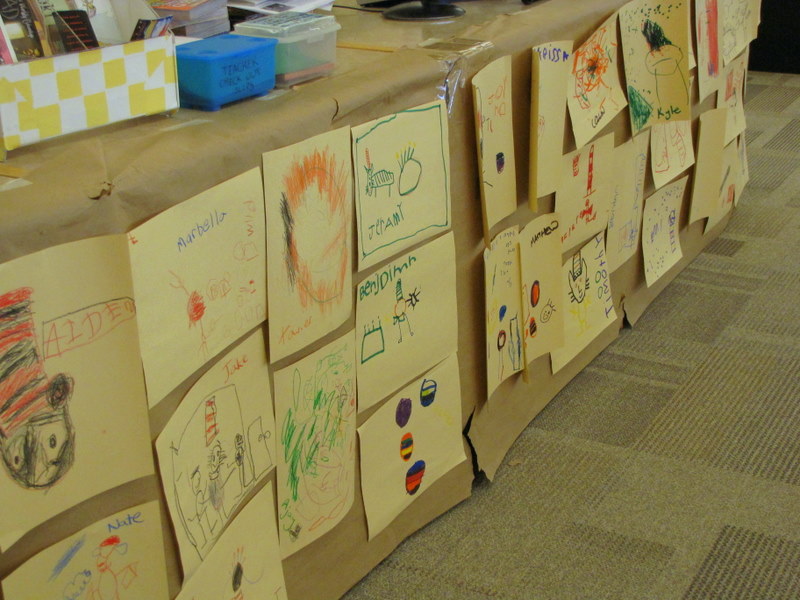 The display on the Library Gallery right now features drawings the pre-k classes made for Dr. Seuss’s birthday. Some interpretations of The Cat in the Hat.