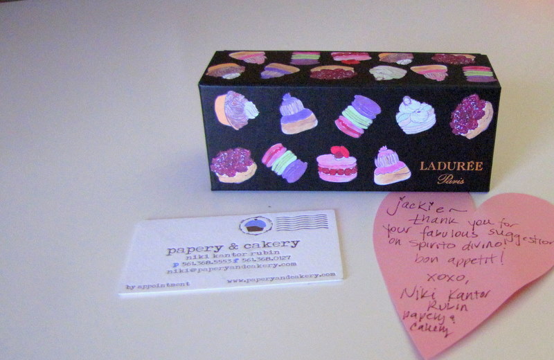 A while back I commented on Papery and Cakery’s blog with suggestions for Niki’s European adventure. She offered a box of Laduree macaroons from Paris for the best suggestion, and I won! I suggested she check out Spirito DiVino, a restaurant in Rome that I love, love, love. And she loved it, too. And my macaroons arrived today! Yay!