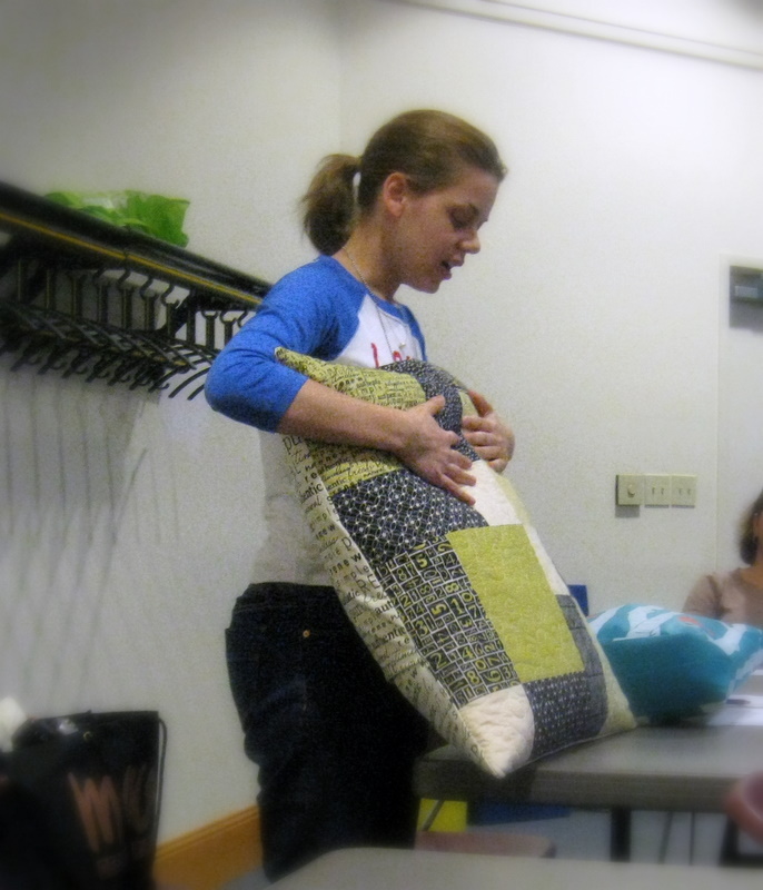 Julie of Jaybird Quilts, our fearless leader, brought a couple of the pillows she made for this Moda Bake Shop tutorial with Quilt Dad, and now I’m determined to replace the gross bed pillows I use for laying around on the couch. I may even make one for my niece Grace, who loves to flop down on the ottoman I made every time she comes over. She’d love her own giant pillow.