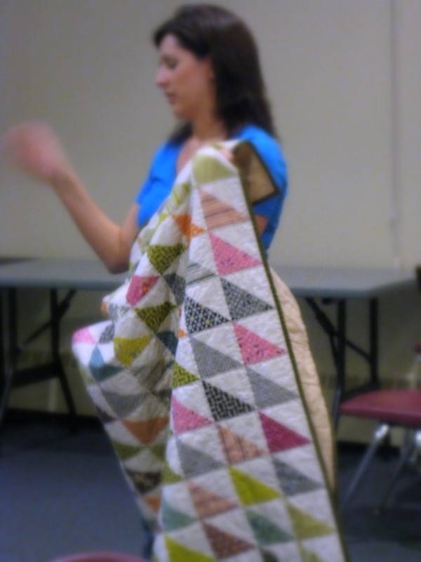 Candi of Raccoon Creek Quilts (love her blog!) brought this half square triangles quilt she just finished using Denyse Schmidt’s Hope Valley fabric. It is seriously awesome.