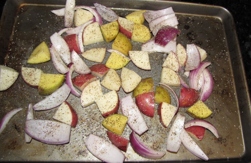 Preheat the oven to 425 degrees F. On a large rimmed baking sheet, toss the potatoes and onions with the oil and season with salt and pepper.