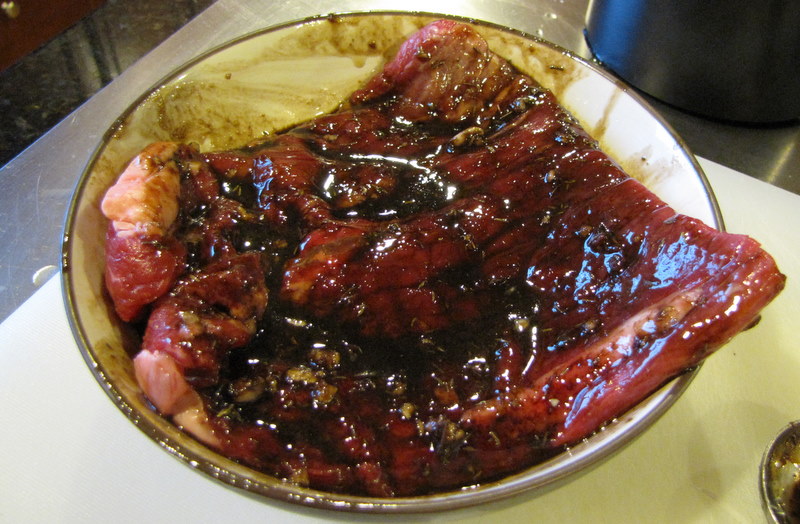 In the April 2010 issue of Food and Wine there was an article on great 60 minute meals, and these were both part of the “Steak Dinner, Italian Style” meal. With some changes. The Gorgonzola deliciousness was originally mushrooms and onions, but swapping out potatoes worked perfectly. And I did not make the polenta. And I only made 1 lb. of flank steak instead of the 2.5 lbs. called for in the recipe, but I made the full amount of marinade. That was just me not thinking about it at the time, but it was nice having the steak good and smothered.