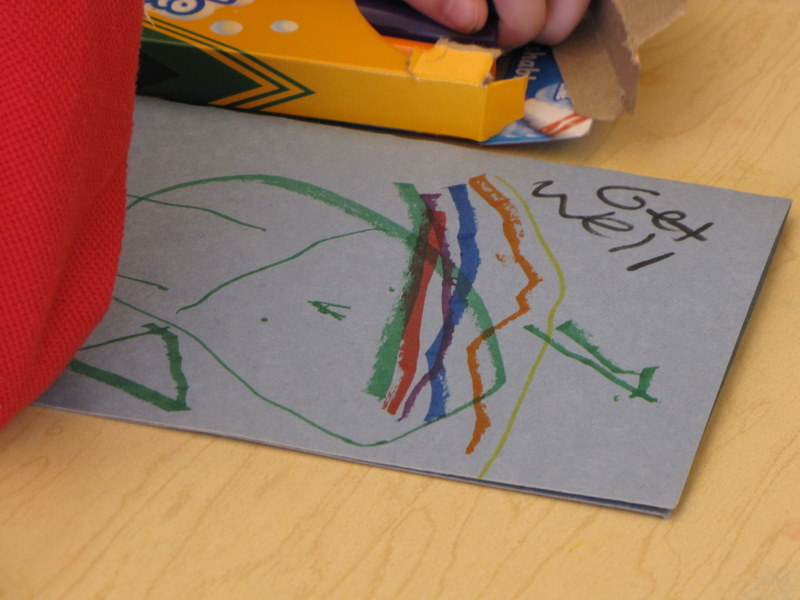 We made Bear some Get Well cards like this one above after reading Bear Feels Sick. I used finger puppets for the different animals he meets in Bear Snores On (I had to improvise some of them, I think I used my squirrel puppet for Badger). We talked about times we’ve been scared after reading Bear Feels Scared, and after Bear’s New Friend we talked about when we’ve made new friends. I used this worksheet from Karma Wilson’s site to ask the kids what they thought Bear would eat during all the different seasons (that was after reading Bear Wants More).