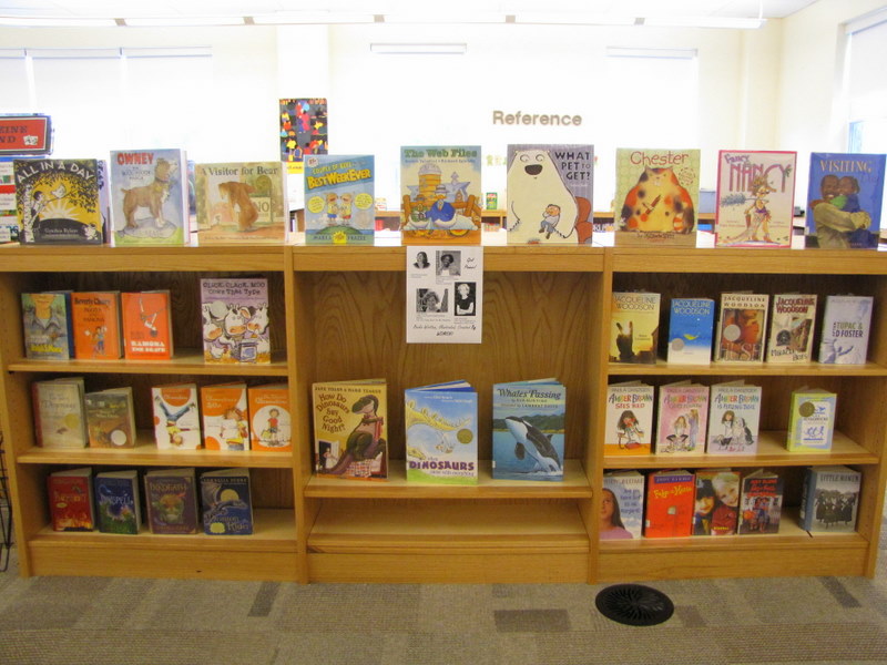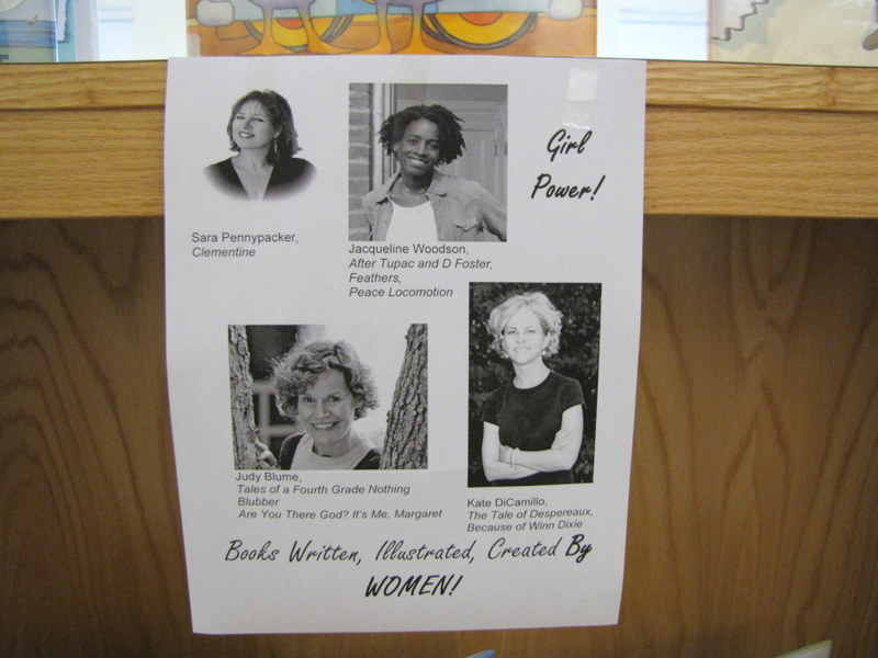 I had the idea to do a Girl Power display of female authors and illustrators this month. A lot of students, boys and girls, assume that authors are always boys. I wanted to highlight all the killer achievements of ladies in children’s lit. There are some male illustrators to female authors in the picture books, but I tried to pick the most interesting things I had. And this is such a great display because I can fill it back up ten times over as these books get checked out.