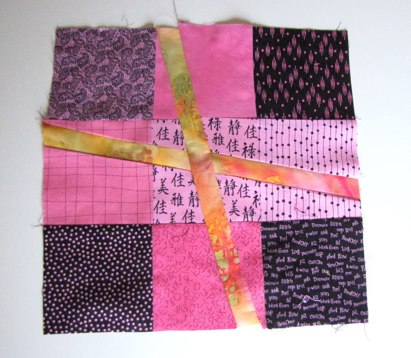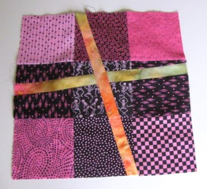 This was Rick’s month for the bee, and he wanted 9 patch blocks with a wonky cross through them. One with a black cross of squares surrounded by pink squares, and the other vice versa. And both of them with this batik running through as the cross.