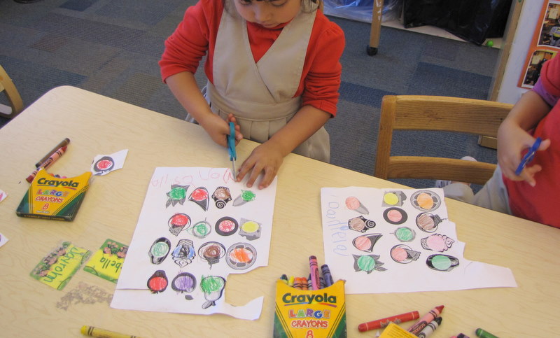 First we read The Very Hungry Caterpillar. Then we spent 2 weeks making “food chains” of all the things the caterpillar eats. I used this site to get pictures of all the foods with holes in them, then I shrunk them down so I could fit them onto 1 sheet per student. First we colored in all the foods together. So I gave all the kids a red crayon first and we colored in all the red foods. Then a yellow crayon, an orange crayon, and so on. It took a lot of patience and guidance to keep them on the food we were coloring; give them a crayon and they want to go to town on the whole paper. And it hadn’t occurred to me that they would all color in the hole in the foods, not the entire foods. But they came out really well, so then the kids cut out the foods (with grown-up assistance as needed).
