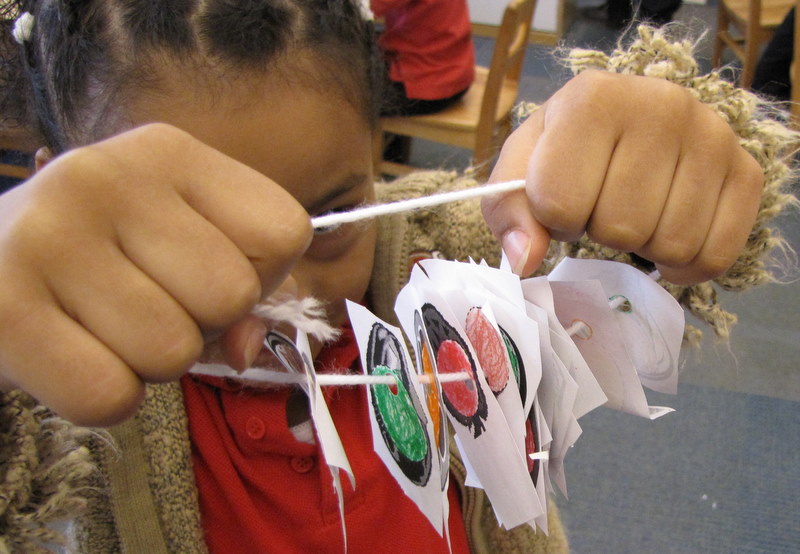 Then I punched holes in their food piles. Then they strung the foods on yarn, and I tied them together to make the chains.