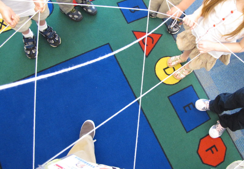 After we read The Very Busy Spider, we did what is possibly my favorite activity with pre-k all year. We get in a circle, and I stand in the middle. I tell them they are each going to be spiders, and I am the fly from the story. We’re going to spin a web just like the spider in the story does, and we’re going to see if we can trap me (the fly) inside. And then I unwind a skein of yarn, giving each student a section to hold. Once our “web” is finished, I try to get out from every direction. The kids just go nuts for this, and I ask them what they’ll do with me now that I’m caught. “Eat you!” they yell. Then I go backwards and wind the yarn back up. When there’s no more web, I ask the kids if I can get out now. “Yes!” Then I ask, “Well, is anyone going to stop me?” And then they all move in and pretend to chomp on me. It’s a little twisted, but I love it. And so do they.