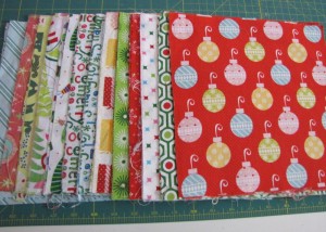 The fabrics are, from left to right: Hip Holidays (by Barbara Jones for Quilt Soup for Henry Glass) Candy Cane in light teal, Have a Sherri Berry Holiday pink ornaments by Sherri Berry for Northcott, this pale green fabric that says Noel all over it (help me out here, this was everywhere 2 years ago and now I can’t remember what it is!), Santa Yule Trees from Michael Miller, Merrytown for Studio E, Secret Santa words fabric by Lori Siebert for Benartex in red/green, Secret Santa in blue/green, Hip Holidays cream Christmas presents, Groove Holiday for Robert Kaufman lime Starburst Dots, Hip Holidays red Snowflake Dots, Groove Holiday Diamond Shine, Groove Holiday Retro Glamour, Hip Holidays red Ornaments.
