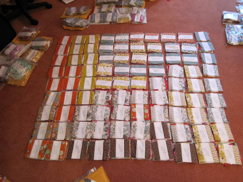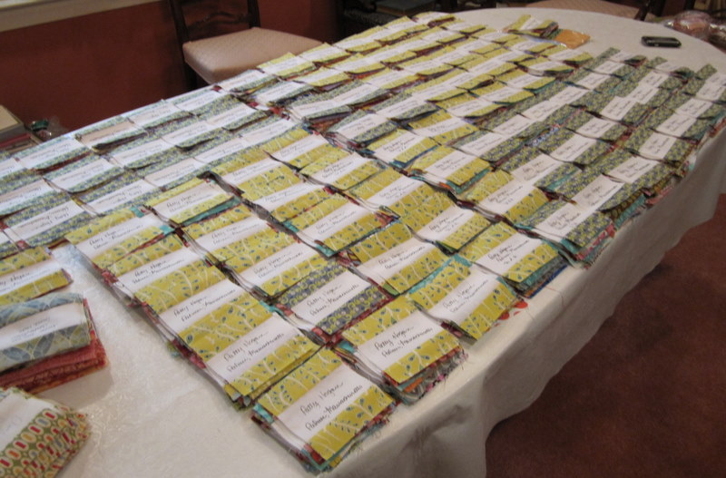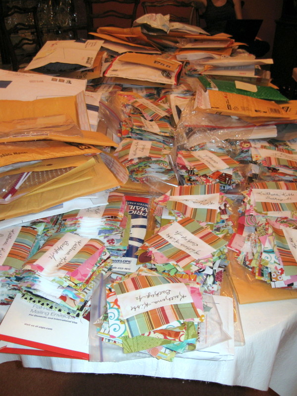 O. M. G. (Candi took that 1st photo). We left just before midnight, and I got home around 1:15 this morning. We were completely delirious by the time we’d finished sorting everything, and I wish I could remember some of the one-liners flying around that table. But we got it done (except for the stuffing in envelopes and mailing part). I can’t imagine Julie sorting all those blocks herself, and I actually had a crazy good time (despite my whining). These ladies crack me up.